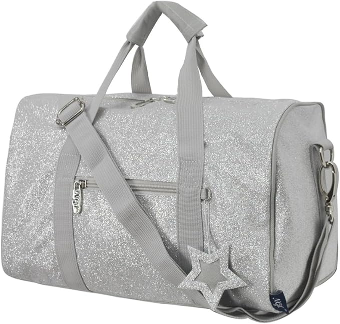 Stylish and Compact Design: The NGIL Super Star Duffle Bag is a mini glitter duffle bag designed for dancers and active lifestyles, featuring a stylish glittery design and a compact size of 13” x 8.5” x 7”.